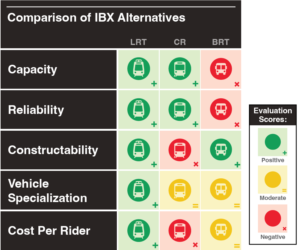 There were many other, nuanced factors for choosing LRT as well. Evading costly construction of new tunnels, avoiding at-grade crossings with vehicular traffic, and complying with federal laws regarding the operation of a commuter line adjacent to a freight line. But the big picture is that the LRT could move the most people, at the highest frequency, for the lowest cost.